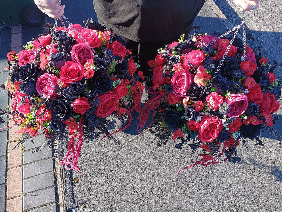 The brief: a stunning pair of luxury artificial hanging baskets in deep shades of red and midnight black.